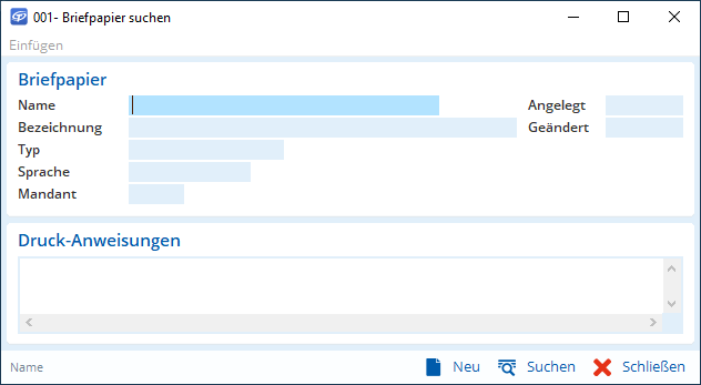 - Wählen Sie den Menüpunkt Briefpapiere aus. Das Fenster Briefpapier suchen wird geöffnet.
