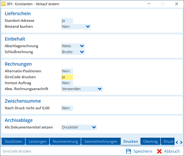- Im Bereich Rechnungen setzen Sie das Feld GiroCode drucken auf Ja.