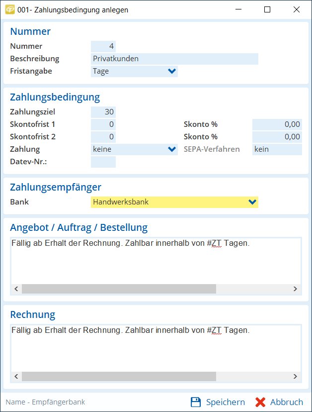 - Im Bereich Angebot / Auftrag / Bestellung und Rechnung tragen Sie die Zahlungsbedingungen in Textform für den Kunden ein.