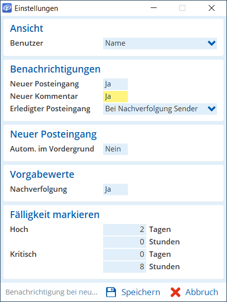 Einstellungen zu Posteingängen. Diese Einstellungen werden benutzerbezogen gespeichert.