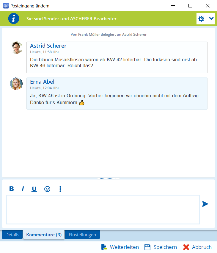 Kommentar beantworten. Kommentare können wir auch schreiben, wenn der Posteingang von einem anderen Benutzer geöffnet und dadurch gesperrt ist.