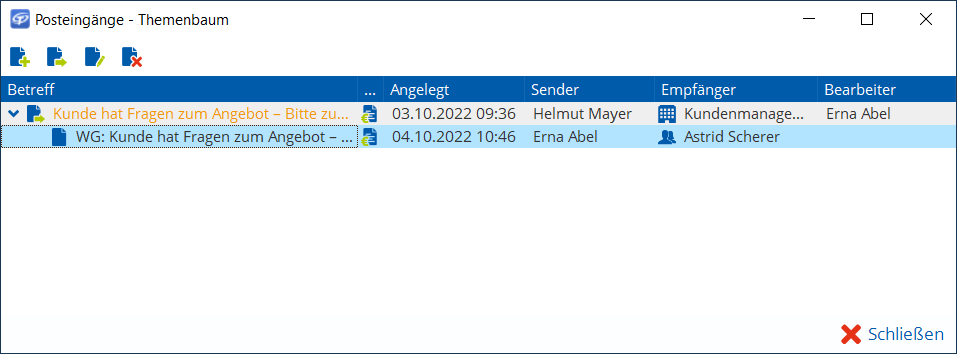 Themenbaum aufrufen. Auf diesem Menüpunkt klicken wir, um den Themenbaum zu öffnen. Hier sehen wir, dass der Posteingang einen untergeordneten Posteingang hat, der an Astrid Scherer gesendet wurde. Die Spalte Bearbeiter ist noch leer, da Astrid Scherer den Posteingang noch nicht angenommen hat.