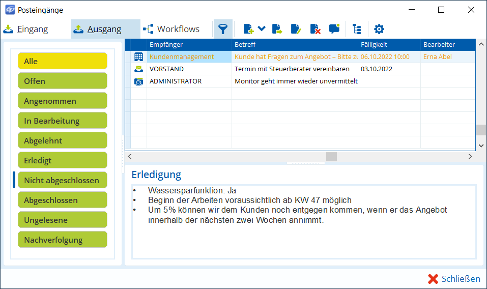Die Posteingänge sind genau dafür da, solche und weitere Probleme zu lösen. Mit den Posteingängen sehen Sie als Sender, ob Ihre Aufgabe noch ungelesen oder bereits in Bearbeitung ist. Als Empfänger können Sie an Aufgaben erinnert werden.