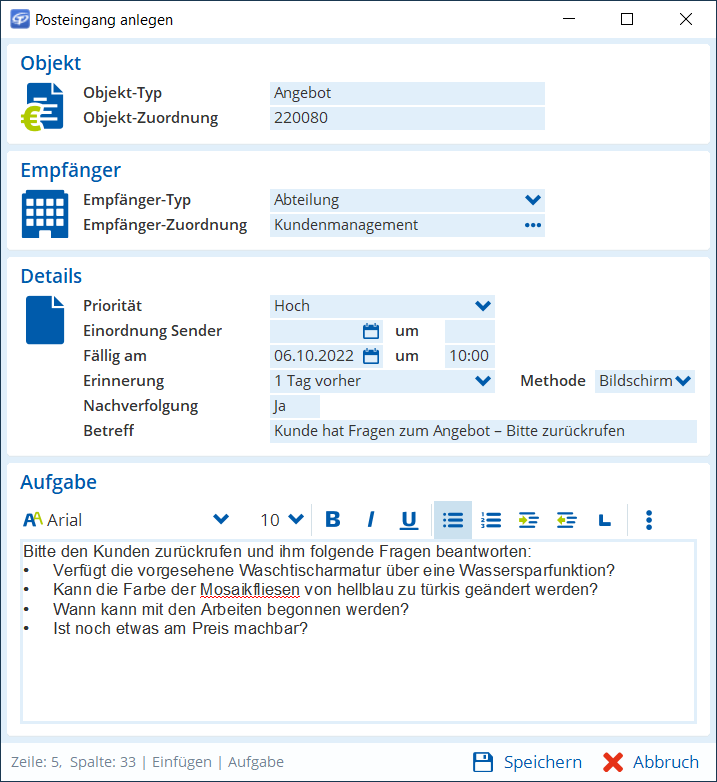 Schließlich schreiben wir in den Betreff des Posteingangs Kunde hat Fragen zum Angebot – Bitte zurückrufen. Im Feld Aufgabe erläutern wir detaillierter, was der Kunde wissen möchte.