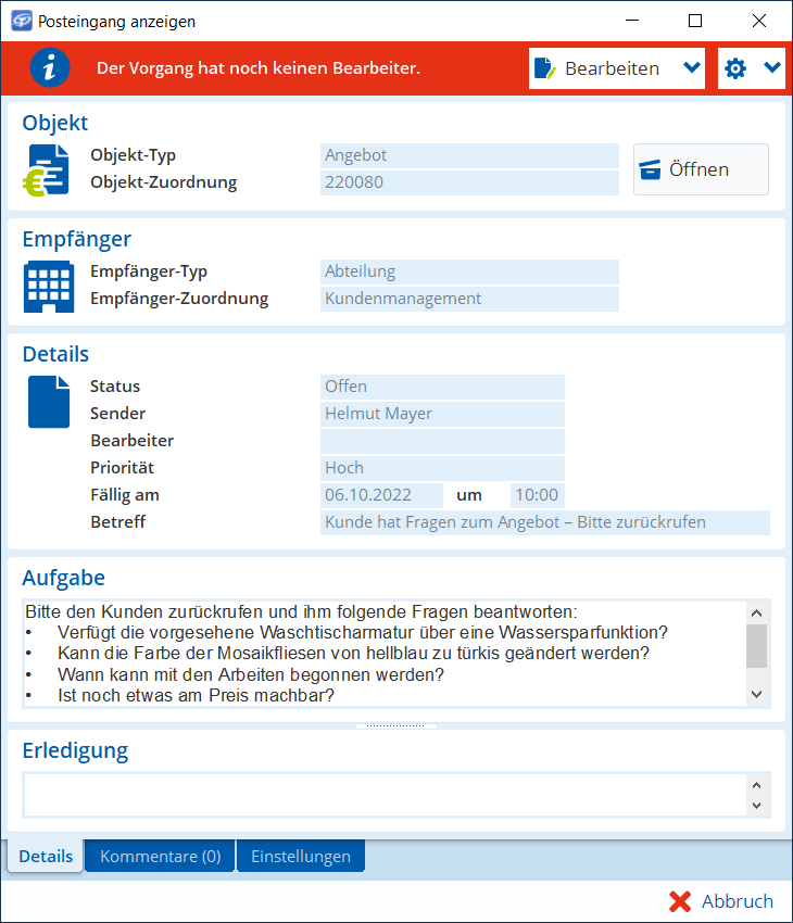 Wir sehen uns das Angebot an und tragen im Posteingang in das Feld Erledigung schon mal die Antworten auf die Fragen ein, die wir beantworten können.