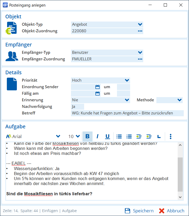 Posteingang anlegen. Das Angebot, um das es geht, ist mit dem Posteingang verknüpft. Dadurch ersparen wir dem Empfänger des Posteingangs die Suche nach dem Angebot.