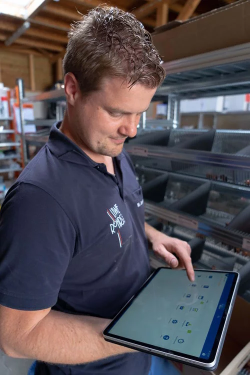 Max Jenschke, Mitarbeiter der Uwe Röhrs GmbH, überprüft mobil via  TAIFUN App die Verfügbarkeit von Materialien und meldet Fehlstände bzw. den Materialbedarf dank Live-Zugriff direkt und mobil vom Lager ins Büro – ganz unkompli