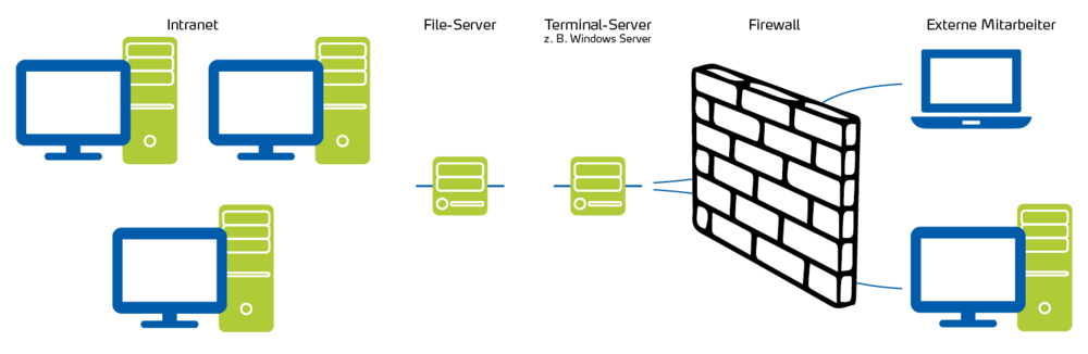 Ehrensache, dass die TAIFUN Software GmbH die TAIFUN Handwerkersoftware und ERP Software selbst einsetzt! Wir haben etliche Mitarbeiter an anderen Standorten, einige Mitarbeiter arbeiten auch häufig von zu Hause aus. Die Mitarbeiter im Haus bilden das Intranet. Sie arbeiten alle an einem File-Server. Dieser ist mit einem Terminal-Server verbunden, der seinerseits Anschluss an eine Hardware-Firewall hat. Externe Mitarbeiter gelangen über das Internet nur durch diese Firewall zum Terminal-Server und haben damit Anschluss an den gemeinsamen File-Server.