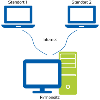 Für kleinere Netzwerke mit zum Beispiel drei Benutzern gibt es relativ preiswerte Lösungen, die sicher und schnell sind. Lassen Sie sich von Ihrem Fachhändler beraten. Wir zeigen Ihnen hier eine Lösung für drei Arbeitsplätze. Ein Mitarbeiter ist am Firmenstandort, zwei andere arbeiten extern.
