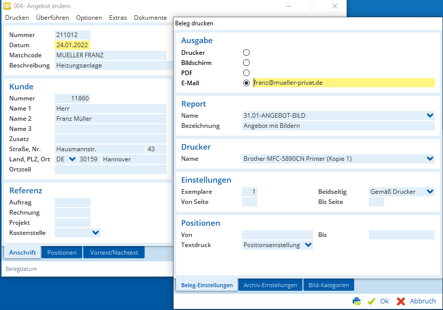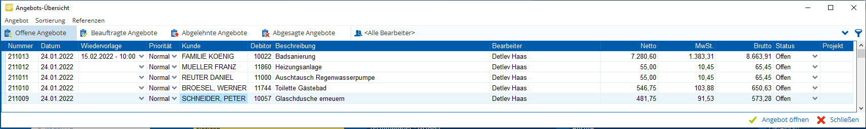 Alle erforderlichen Daten zum Kunden wie beispielsweise Konditionen, Zahlungsmodalität, sowie vorherige Angebote und Aufträge haben Sie übersichtlich über Ihre zentrale Adressverwaltung parat, über die Sie ganz bequem weitere Angebote erstellen können. Der Angebotsversand und die Rechnungserstellung sowie -nachverfolgung und das automatisierte Mahnwesen runden diesen Teil Ihrer betriebswirtschaftlichen Arbeit ab.