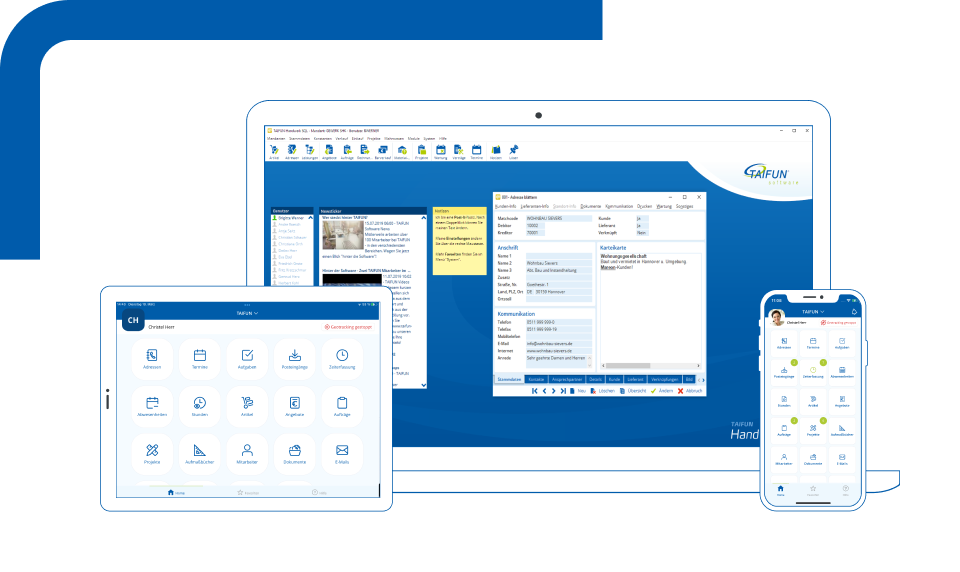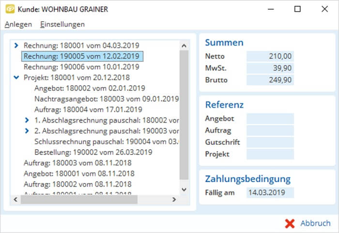 Erstellen Sie mit der TAIFUN Handwerkersoftware Ihre Angebote schnell und fehlerfrei. Wenn Sie einen Kunden auswählen, können Sie gleichzeitig dessen Konditionen, Zahlungsmodalität und weitere einsehen.
