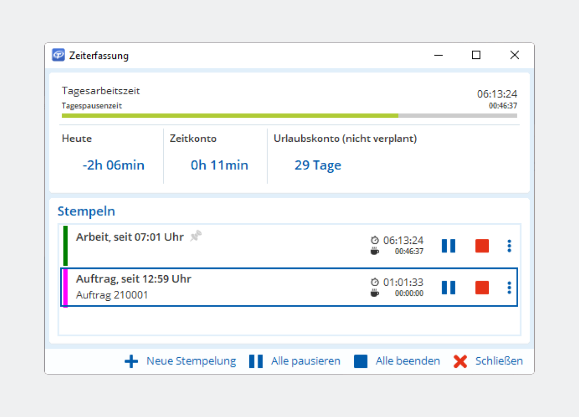 - Auftrags- und projektbezogene Zeiterfassung