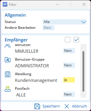 verknüpft ist und ob der Posteingang einen Bearbeiter hat.