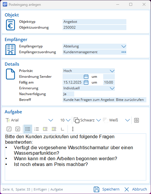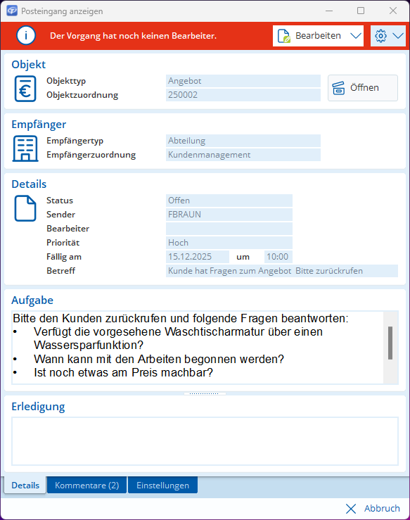 - Tragen Sie im Posteingang die Erledigung des Posteingangs ein, z. B. Antworten auf Fragen zum Angebot des Kunden.