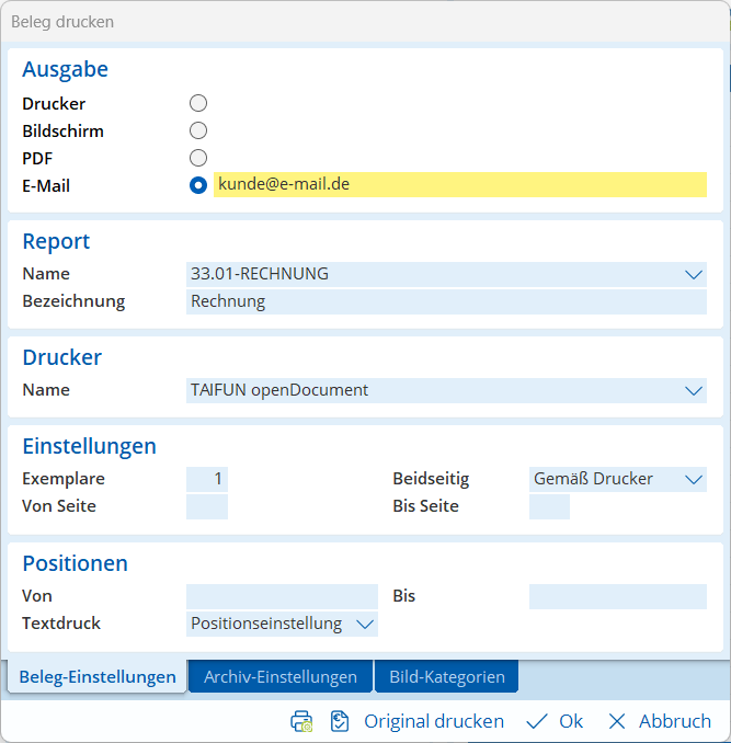 Im Bereich Ausgabe ist bereits die Option E-Mail vorausgewählt und die unter Elektronische Belege angegebene E-Mail-Adresse ist eingetragen.