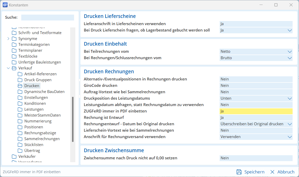 - Unter Verkauf > Drucken im Bereich Drucken Rechnungen setzen Sie das Feld ZUGFeRD immer
