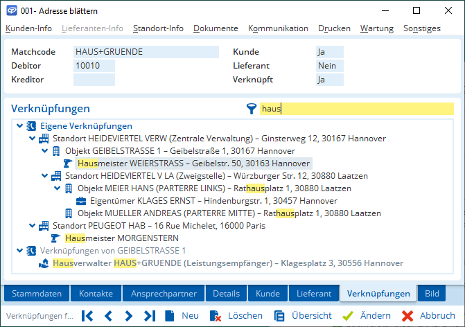 Bislang waren Adressen immer direkt miteinander verknüpft: Mieter bzw. Standorte, Lieferanschriften, in Projekten der Bauherr oder Architekt usw. Jetzt können Sie Adressen frei miteinander verknüpfen. Die Verknüpfungen werden in einer Baumstruktur übersichtlich dargestellt, in der Sie Einträge neu anlegen, verschieben und löschen können. Die Einträge können auch verschachtelt sein, so dass z. B. ein Standort weitere Standorte enthält.